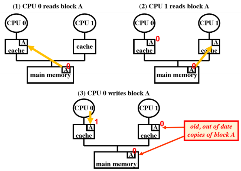 (3) 이 때, CPU 0이 Local cache에 있는 block A 값을 1로 바꾼다면, CPU 1의 local cache와 값이 다르게 된다.